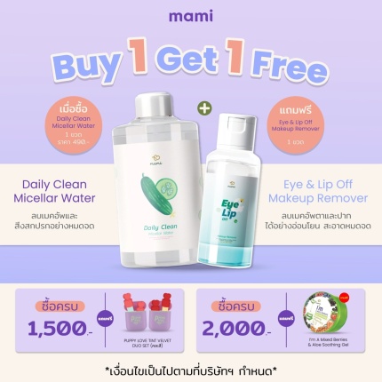 Daily Clean Micella Water แถมฟรี Eye-Lip Off Makeup Remover 1 ชิ้น ฿490.00